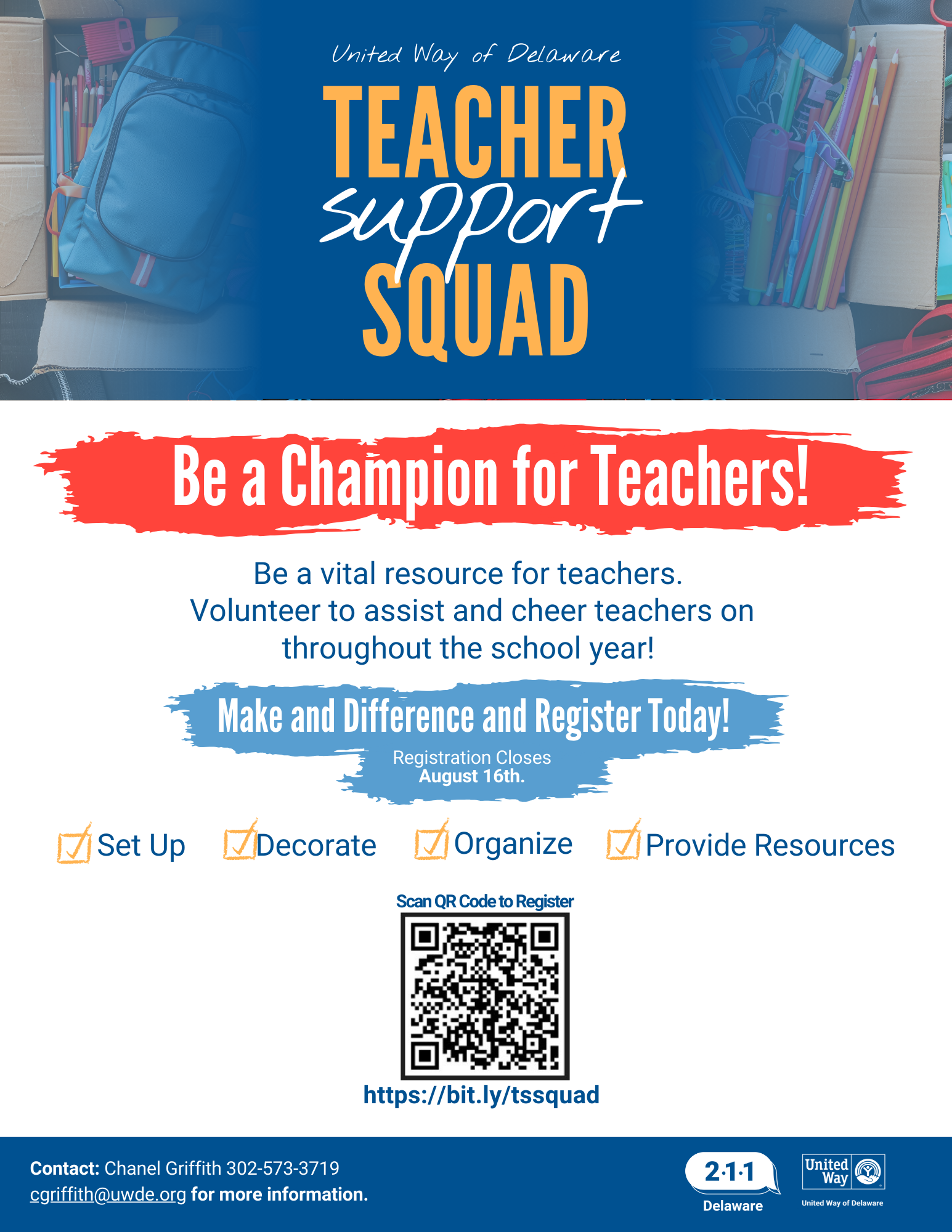 Join the Squad of volunteers who will give teachers an A --assistance -- during the weeks of August 19 and August 26. Three-hour shifts are available for your choosing.